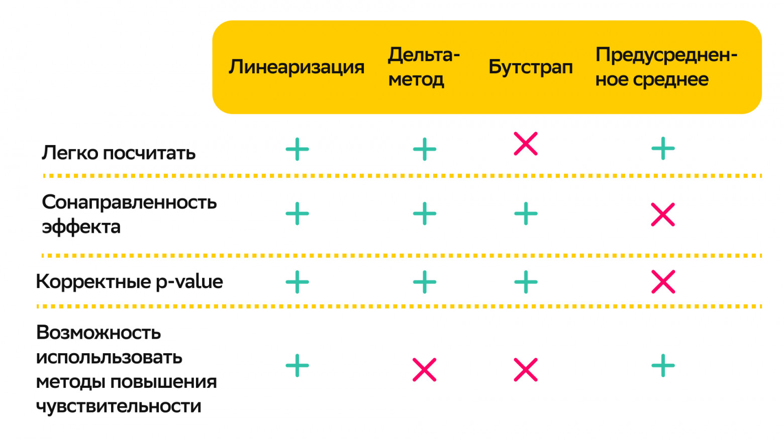 ΠΠ΅Π΄ΠΎΡΡΠ°ΡΠΊΠΈ Ρ ΠΏΠΎΠ΄Ρ ΠΎΠ΄Π° ΡΠΎΠΆΠ΅ Π΅ΡΡΡ. Π’Π°ΠΊ ΠΊΠ°ΠΊ ΠΌΡ Π½Π΅ ΡΠ°Π±ΠΎΡΠ°Π΅ΠΌ Π½Π°ΠΏΡΡΠΌΡΡ Ρ ΠΏΠΎΠ»ΡΠ·ΠΎΠ²Π°ΡΠ΅Π»ΡΡΠΊΠΈΠΌΠΈ ΡΠΈΠ³Π½Π°Π»Π°ΠΌΠΈ, ΡΠΎ Π΄Π»Ρ ratio-ΠΌΠ΅ΡΡΠΈΠΊ Π½Π΅ ΠΏΠΎΠ»ΡΡΠΈΡΡΡ ΠΈΡΠΏΠΎΠ»ΡΠ·ΠΎΠ²Π°ΡΡ ΠΌΠ΅ΡΠΎΠ΄Ρ ΠΏΠΎΠ²ΡΡΠ΅Π½ΠΈΡ ΡΡΠ²ΡΡΠ²ΠΈΡΠ΅Π»ΡΠ½ΠΎΡΡΠΈ, Ρ.Π΅. Π² ΡΠΊΡΠΏΠ΅ΡΠΈΠΌΠ΅Π½ΡΠ°Ρ Π΄Π»Ρ ΠΏΠΎΠ»ΡΠ·ΠΎΠ²Π°ΡΠ΅Π»ΡΡΠΊΠΈΡ ΠΊΠΎΠ½Π²Π΅ΡΡΠΈΠΉ ΠΈ ΡΡΠ΅Π΄Π½ΠΈΡ ΠΏΠΎΠ»ΡΠ·ΠΎΠ²Π°ΡΠ΅Π»ΡΡΠΊΠΈΡ ΠΌΠ΅ΡΡΠΈΠΊ ΠΌΠΎΠΆΠ½ΠΎ ΠΏΡΠΈΠΌΠ΅Π½ΠΈΡΡ CUPED, Π΄Π»Ρ ratio-ΠΌΠ΅ΡΡΠΈΠΊ β Π½Π΅Ρ.