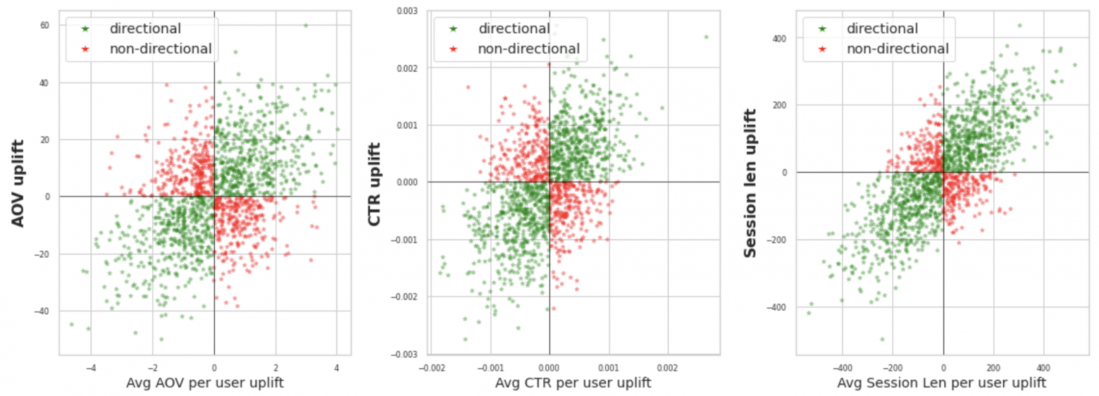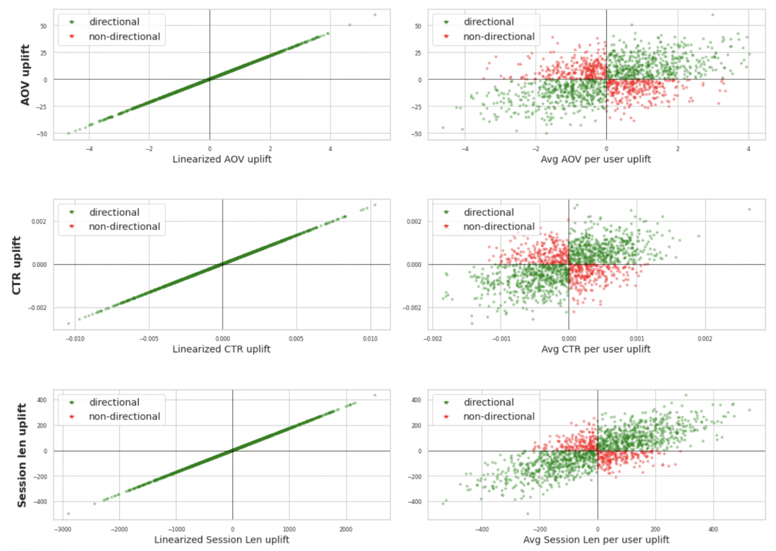 ΠΠΎ ΠΏΠ΅ΡΠ²ΡΡ , Π² ΠΎΡΠ»ΠΈΡΠΈΠΈ ΠΎΡ ΠΏΡΠ΅Π΄ΡΡΡΠ΅Π΄Π½Π΅Π½Π½ΠΎΠ³ΠΎ ΡΡΠ΅Π΄Π½Π΅Π³ΠΎ, ΡΠ°Π·Π½ΠΈΡΠ° Π»ΠΈΠ½Π΅Π°ΡΠΈΠ·ΠΎΠ²Π°Π½Π½ΡΡ ΠΌΠ΅ΡΡΠΈΠΊ Π²ΡΠ΅Π³Π΄Π° ΡΠΎΡ ΡΠ°Π½ΡΠ΅Ρ ΡΠΎΠ½Π°ΠΏΡΠ°Π²Π»Π΅Π½Π½ΠΎΡΡΡ Ρ ΠΈΠ·ΠΌΠ΅Π½Π΅Π½ΠΈΠ΅ΠΌ Π² ΡΠ΅Π»Π΅Π²ΠΎΠΉ ratio-ΠΌΠ΅ΡΡΠΈΠΊΠ΅. ΠΠ°ΠΏΡΠΈΠΌΠ΅Ρ, Π΅ΡΠ»ΠΈ Π² ΡΠΊΡΠΏΠ΅ΡΠΈΠΌΠ΅Π½ΡΠ΅ CTR Π²ΡΡΠΎΡ ΠΈΠ»ΠΈ ΡΠΏΠ°Π», ΡΠΎ Π»ΠΈΠ½Π΅Π°ΡΠΈΠ·ΠΎΠ²Π°Π½Π½ΡΠΉ CTR Π²ΡΠ΅Π³Π΄Π° ΠΈΠ·ΠΌΠ΅Π½ΠΈΡΡΡ Π² ΡΡ ΠΆΠ΅ ΡΡΠΎΡΠΎΠ½Ρ. (ΠΠΎ ΡΠ΅ΠΎΡΠ΅ΠΌΠ΅ Π²ΡΡΠ΅)