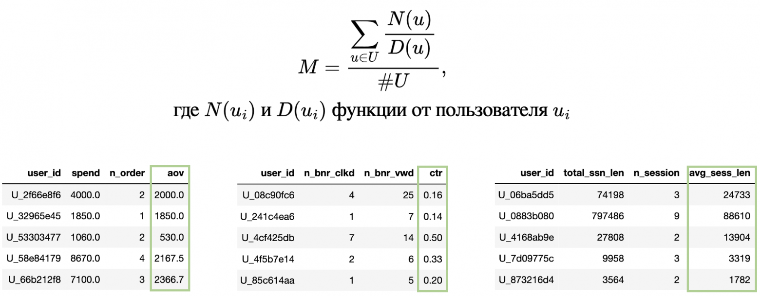 ΠΠΎΠ³Π΄Π° Π² ΡΠΊΡΠΏΠ΅ΡΠΈΠΌΠ΅Π½ΡΠ΅ Ρ ΠΎΡΠ΅ΡΡΡ ΠΏΠΎΡΡΠΈΡΠ°ΡΡ ΠΌΠ΅ΡΡΠΈΠΊΡ ΠΎΡΠ½ΠΎΡΠΈΡΠ΅Π»ΡΠ½ΠΎ Π΄ΡΡΠ³ΠΎΠΉ Π΅Π΄ΠΈΠ½ΠΈΡΡ Π°Π½Π°Π»ΠΈΠ·Π°, ΠΎΡΠ»ΠΈΡΠ½ΠΎΠΉ ΠΎΡ Π΅Π΄ΠΈΠ½ΠΈΡΡ ΡΠ°Π½Π΄ΠΎΠΌΠΈΠ·Π°ΡΠΈΠΈ, ΡΠΎ ΠΏΠΎΡΠ²Π»ΡΠ΅ΡΡΡ ratio-ΠΌΠ΅ΡΡΠΈΠΊΠ°, ΠΊΠΎΡΠΎΡΠ°Ρ ΠΈΠΌΠ΅Π΅Ρ ΠΎΡΠΎΠ±Π΅Π½Π½ΠΎΡΡΡ Π² ΡΠΎΡΠΌΠ°Π»ΡΠ½ΠΎΠΌ ΠΎΠΏΡΠ΅Π΄Π΅Π»Π΅Π½ΠΈΠΈ ΡΠ΅ΡΠ΅Π· Π΅Π΄ΠΈΠ½ΠΈΡΡ ΡΠ°Π½Π΄ΠΎΠΌΠΈΠ·Π°ΡΠΈΠΈ. ΠΠ½ΡΠ΅ΡΠ΅ΡΡΡΡΠ°Ρ Π² ΡΠΊΡΠΏΠ΅ΡΠΈΠΌΠ΅Π½ΡΠ΅ Π΅Π΄ΠΈΠ½ΠΈΡΠ° Π°Π½Π°Π»ΠΈΠ·Π° Π²ΡΠ΅Π³Π΄Π° Π½Π°Ρ ΠΎΠ΄ΠΈΡΡΡ Π² Π·Π°Π²ΠΈΡΠΈΠΌΠΎΡΡΠΈ ΠΎΡ Π΅Π΄ΠΈΠ½ΠΈΡΡ ΡΠ°Π½Π΄ΠΎΠΌΠΈΠ·Π°ΡΠΈΠΈ. ΠΡΠΈ ΡΡΠΎΠΌ ΡΠ°ΠΌΠΈ Π·Π°Π²ΠΈΡΠΈΠΌΡΠ΅ ΡΡΡΠ½ΠΎΡΡΠΈ ΠΈ ΠΈΡ ΡΠΈΠ³Π½Π°Π»Ρ ΠΌΠΎΠΆΠ½ΠΎ Β«ΡΠ²Π΅ΡΠ½ΡΡΡΒ» Π΄ΠΎ Π΄Π²ΡΡ ΡΠΎΠΎΡΠ²Π΅ΡΡΡΠ²ΡΡΡΠΈΡ ΠΏΠΎΠ»ΡΠ·ΠΎΠ²Π°ΡΠ΅Π»ΡΡΠΊΠΈΡ ΡΠΈΠ³Π½Π°Π»ΠΎΠ². Π ΠΏΡΠΈΠΌΠ΅ΡΡ, Π΅ΡΠ»ΠΈ Ρ ΠΏΠΎΠ»ΡΠ·ΠΎΠ²Π°ΡΠ΅Π»Ρ Π΅ΡΡΡ ΡΡΠΈ Π·Π°ΠΊΠ°Π·Π° Ρ ΠΎΠΏΡΠ΅Π΄Π΅Π»Π΅Π½Π½ΡΠΌΠΈ ΡΠ΅Π½Π°ΠΌΠΈ, ΡΠΎ Π΄Π»Ρ ΡΡΠΎΠ³ΠΎ ΠΏΠΎΠ»ΡΠ·ΠΎΠ²Π°ΡΠ΅Π»Ρ Π½ΡΠΆΠ½ΠΎ ΠΏΡΠΎΡΡΠΎ ΠΏΠΎΡΡΠΈΡΠ°ΡΡ ΡΠΈΡΠ»ΠΎ Π·Π°ΠΊΠ°Π·ΠΎΠ² ΠΈ ΡΡΠΌΠΌΠ°ΡΠ½ΡΠ΅ ΡΡΠ°ΡΡ ΠΏΠΎ Π½ΠΈΠΌ. ΠΡΠΎΠ΄Π΅Π»Π°Π² ΡΠ°ΠΊ Π΄Π»Ρ Π²ΡΠ΅Ρ ΠΏΠΎΠ»ΡΠ·ΠΎΠ²Π°ΡΠ΅Π»Π΅ΠΉ, Π΄Π°Π»ΡΡΠ΅ ΠΌΠΎΠΆΠ½ΠΎ ΡΠ»ΠΎΠΆΠΈΡΡ ΡΠΈΠ³Π½Π°Π»Ρ ΠΏΠΎ Π΄Π²ΡΠΌ Π½ΠΎΠ²ΡΠΌ ΠΏΠΎΠ»ΡΠΌ ΠΈ ΠΏΠΎΠ΄Π΅Π»ΠΈΡΡ ΠΈΡ ΡΡΠΌΠΌΡ Π΄ΡΡΠ³ Π½Π° Π΄ΡΡΠ³Π°, ΡΠ°ΠΊ ΠΏΠΎΠ»ΡΡΠΈΡΡΡ ΡΡΠ΅Π΄Π½Π΅Π΅ Π·Π½Π°ΡΠ΅Π½ΠΈΠ΅ Π΄Π»Ρ ΠΈΠ½ΡΠ΅ΡΠ΅ΡΡΡΡΠ΅ΠΉ Π΅Π΄ΠΈΠ½ΠΈΡΡ Π°Π½Π°Π»ΠΈΠ·Π°, Π² Π½Π°ΡΠ΅ΠΌ ΡΠ»ΡΡΠ°Π΅ β ΡΡΠ΅Π΄Π½ΠΈΠΉ ΡΠ΅ΠΊ.